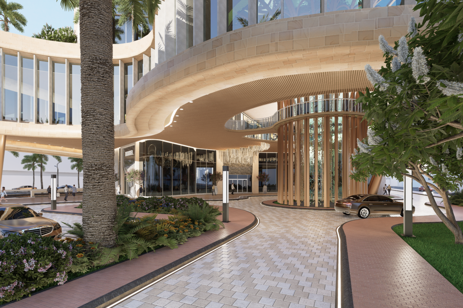 The glass facades and fluid architectural design reflect modernity and the luxurious urban character that distinguishes Tazyeed projects.